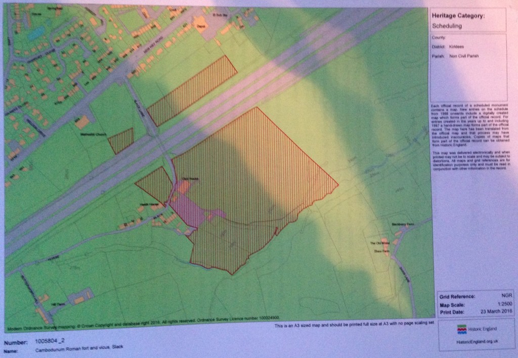 In the summer of 2016 the founder of Romanised, Heritage House Research’s Benjamin Dunn visited the site and spoke with local farmer Fred Shaw. Mr Shaw who is the owner of the field which had gained the interest of archaeologists in recent times allowed Dunn to photograph some of the literature he had accumulated in relation to the site. This included a recent news article from the Huddersfield Examiner and a print-out showing a geophysical survey conducted by Dr Armin Schmidt of the University of Bradford and English Heritage.