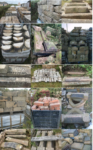 This sale includes 70 pallets of cut sandstone (approx 4 sq yards per pallet), 21 pallets of granite cobbles, wall cappings approx. 200ft in length, round wall cappings approx. 100ft in length, 2 stillages of handmade bricks, window uprights approx. 12 in total, plus lots more stone not photographed or mentioned.